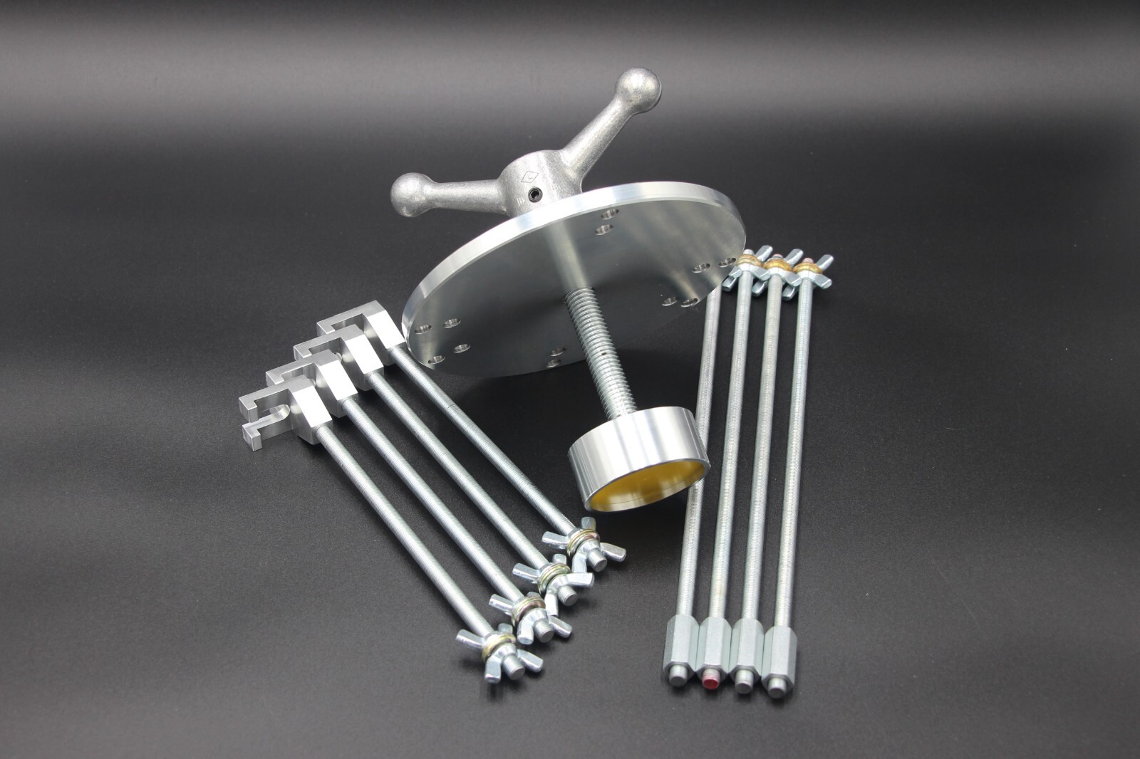 7” diameter Body, drilled for a 3 and 4 blade attachment pattern on 2 individual bolt circles for motor size flexibility. Main Shaft has 5” of travel and is driven by a 6" removable handle. Pushing Cap has a non-removable free spinning swivel head with a large inside diameter cup. Included are 4 threaded long rods with mounting couplers, 4 threaded short rods with custom machined forks and all associated wingnuts and washers.