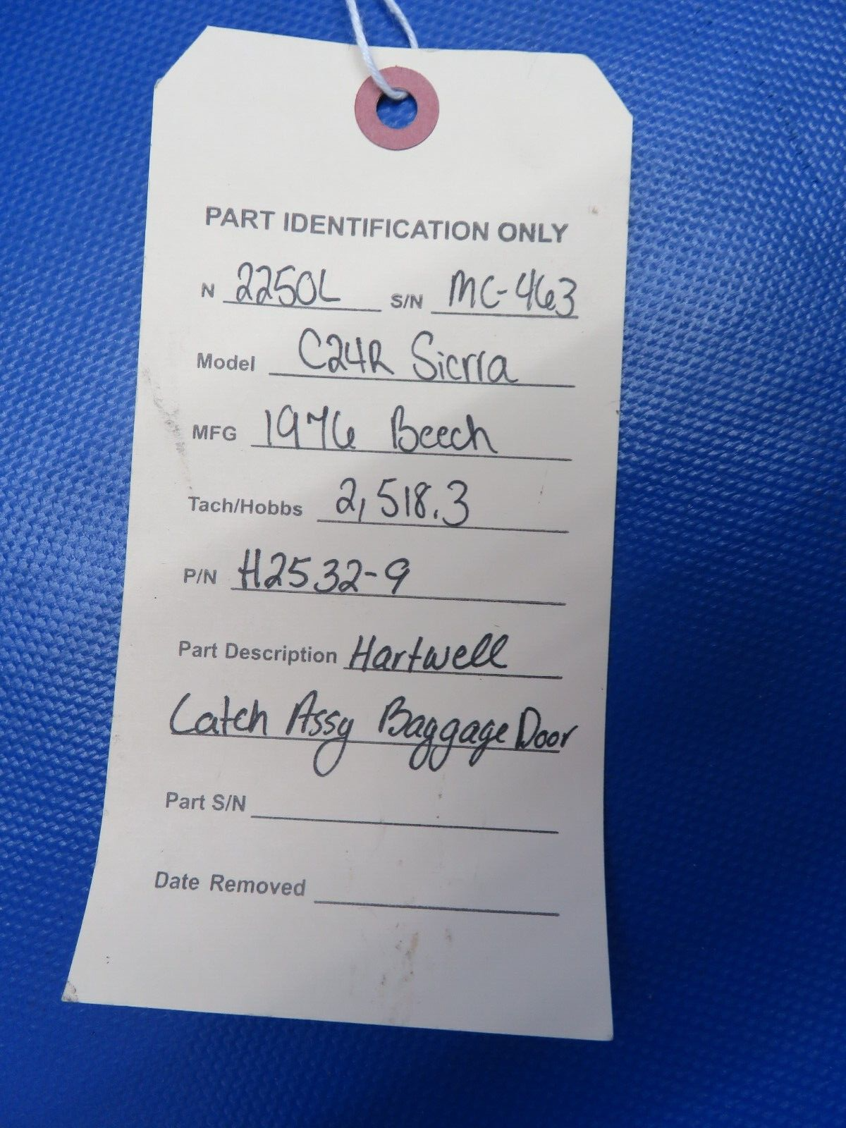 Beech C24R Sierra Hartwell Catch Assembly Baggage Door. P/N H2532-9. Removed in good condition from a parted out 1976 Beech C24R Sierra N2250L, S/N MC-463. TTAF 2,518.3. Guaranteed to pass inspection or your money back.