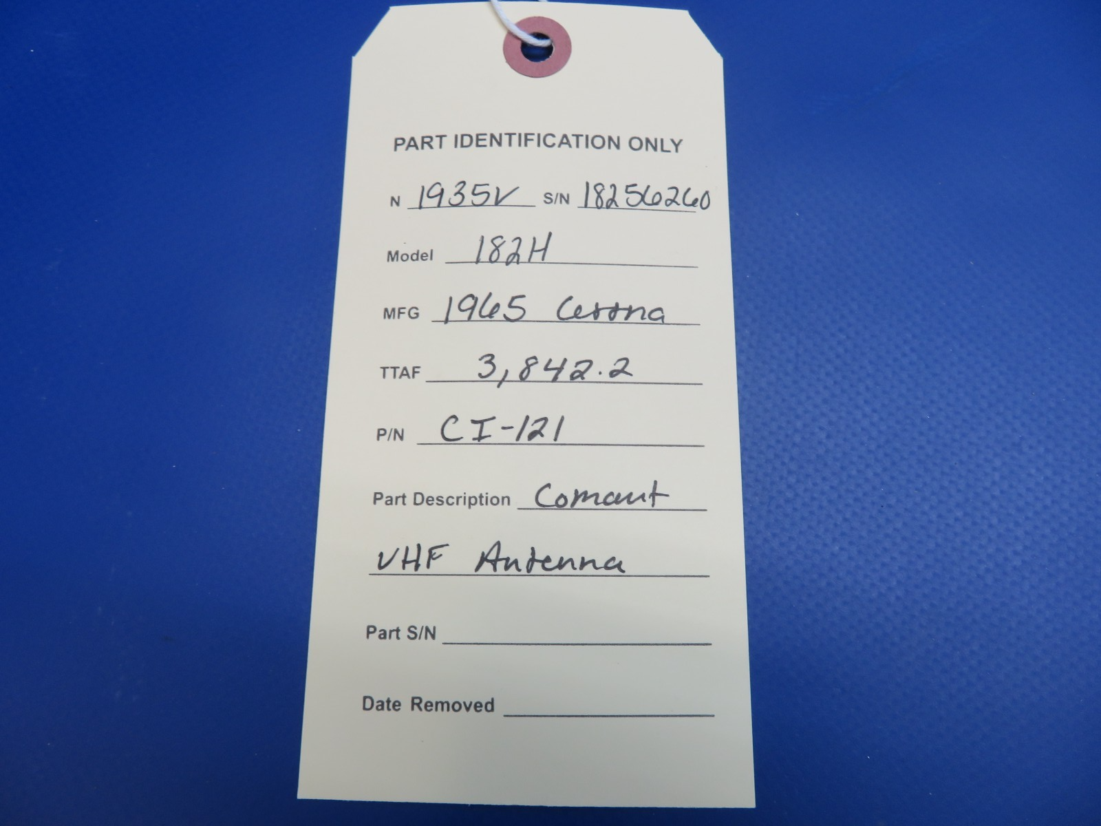 Comant VHF Communications Antenna. P/N CI-121. Removed in good condition from a 1965 Cessna 182H N1935V, S/N 18256260. TTAF 3,842.2. Guaranteed to pass inspection or your money back.