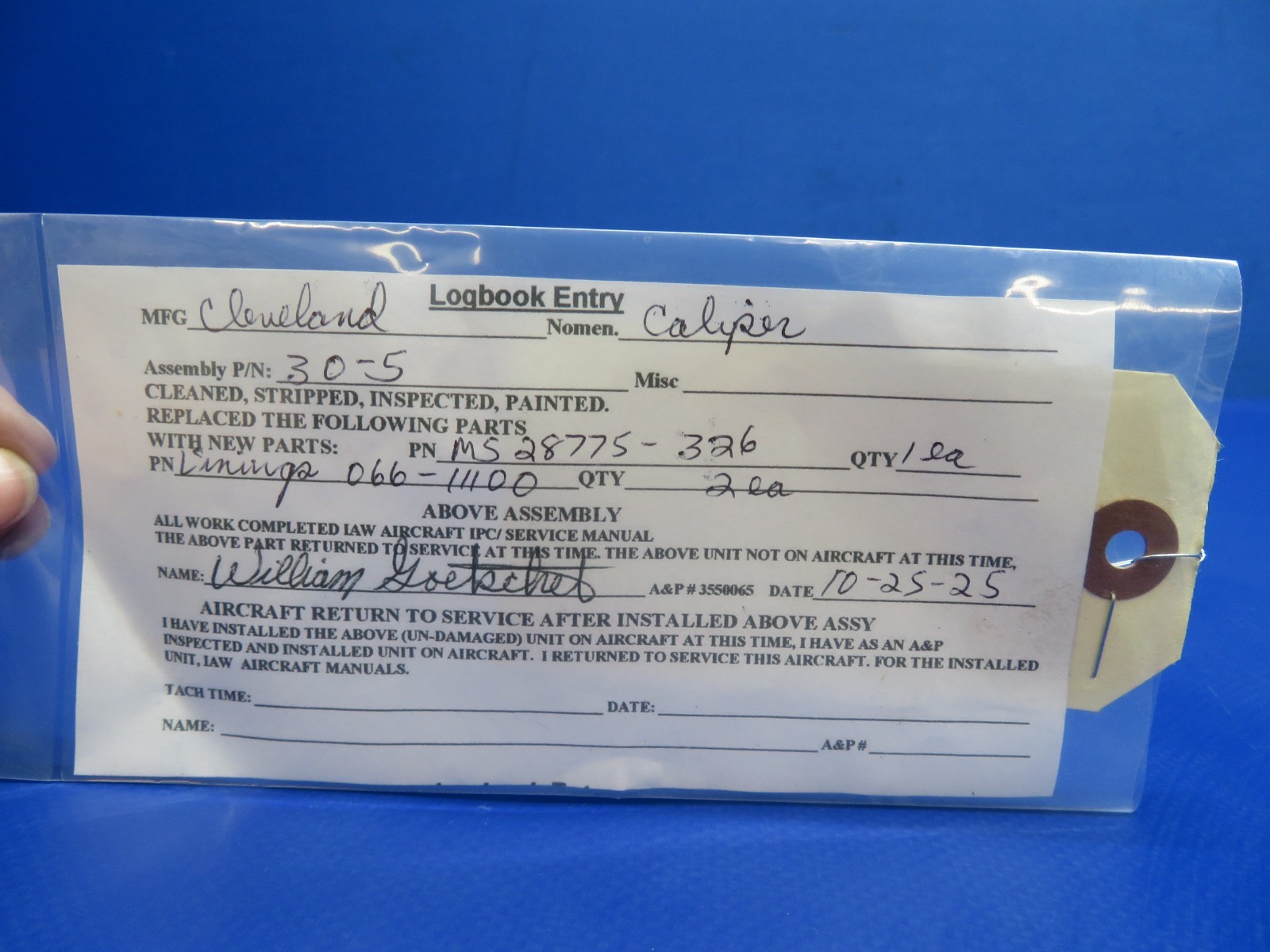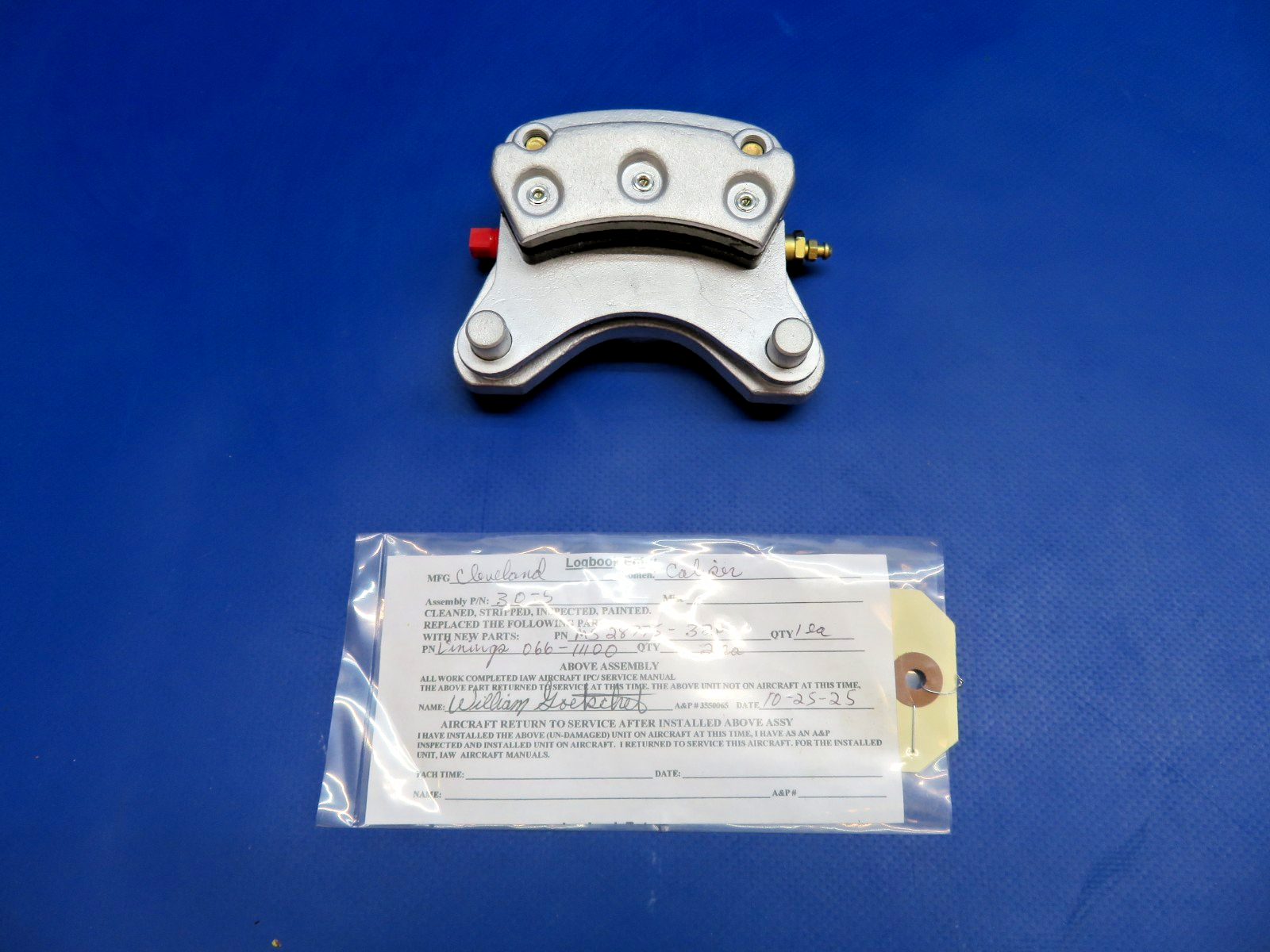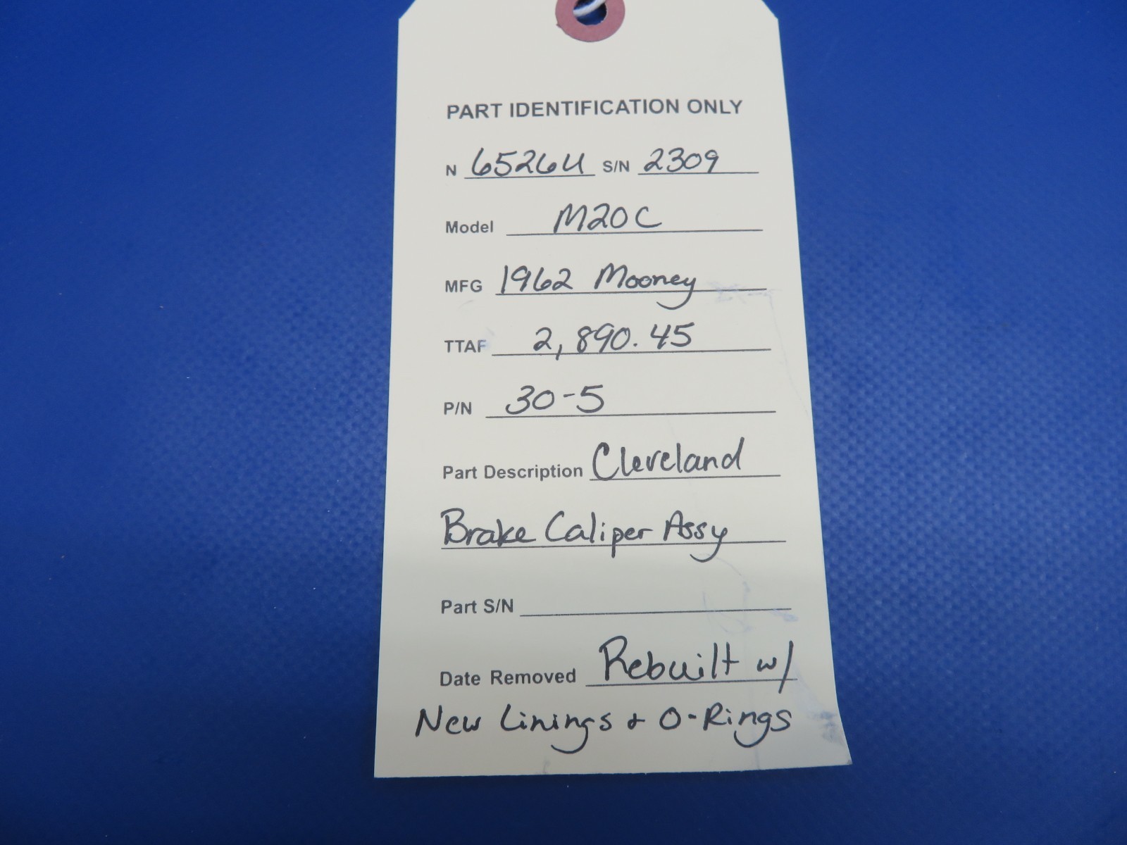 Mooney M20 / M20C Cleveland Brake Caliper Assembly. P/N 30-5. REBUILT with New Linings and New O-Rings. Removed in good condition from a parted out 1962 Mooney M20C N6526U, S/N 2309. TTAF 2,890.45. Guaranteed to pass inspection or your money back.