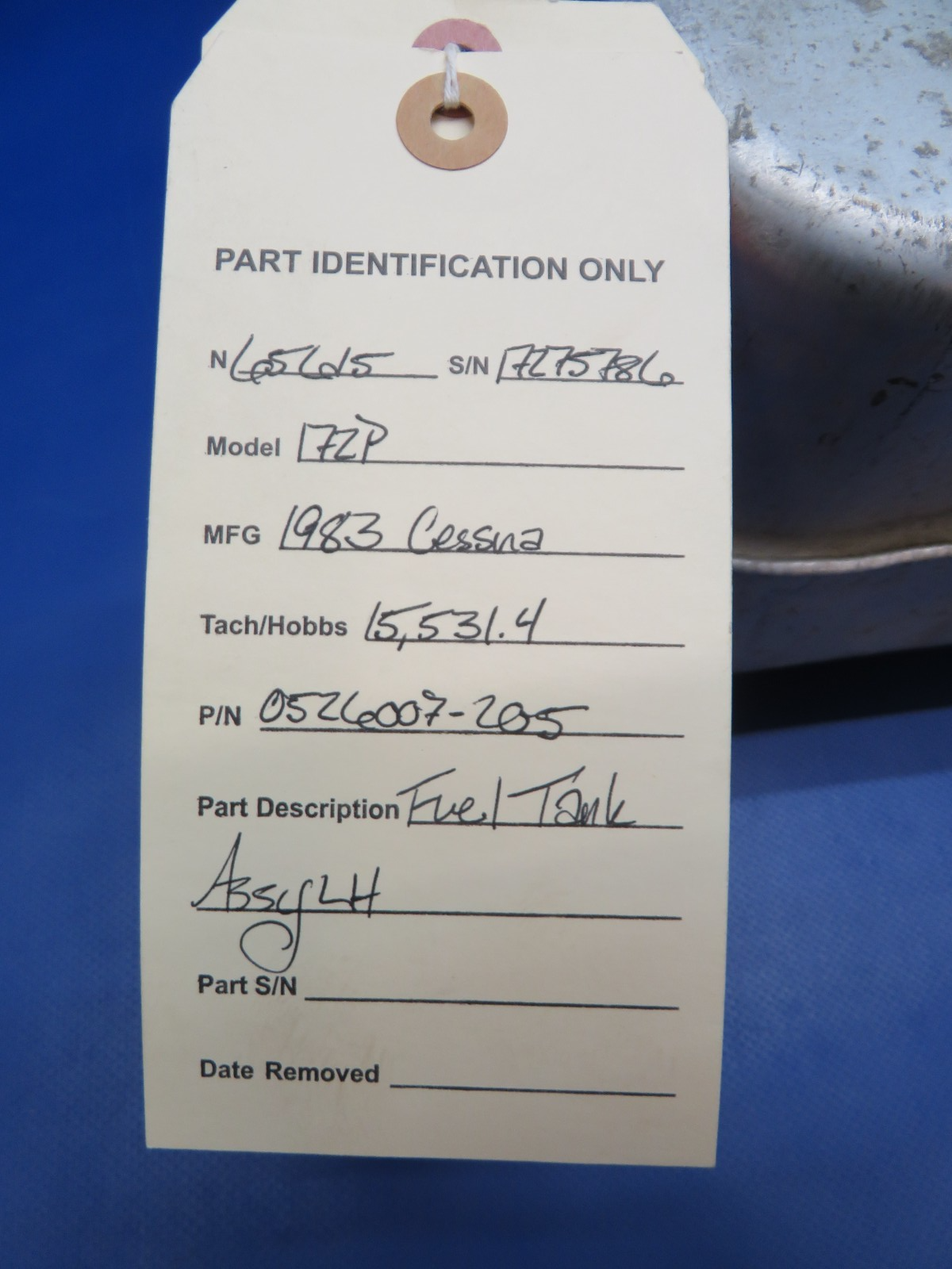 Cessna 172 / 172P Fuel Tank Assembly Left Hand. P/N 0526007-205. This item was recently pressure tested and found to be in working condition. Vent valve was bad and removed. Filler neck was removed. Light exterior corrosion, and a few dents, see photos. Removed from a parted out 1983 Cessna 172 / 172P N65615, S/N 17275786. TTAF 15,531.4. Guaranteed to pass inspection or your money back.