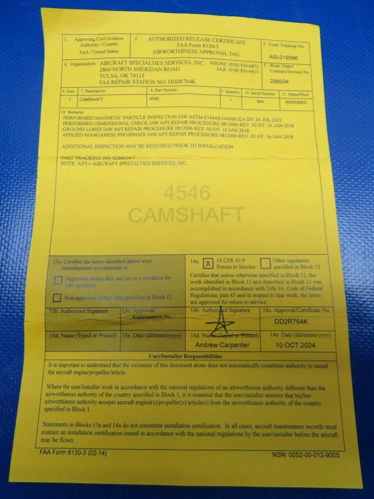Continental A-65 Camshaft. P/N 4546 REPAIRED w/ 8130 on 10-10-2024 by Aircraft Specialties Services. Due to multiple quantities buyer may not receive exact item pictured. Guaranteed to pass inspection or your money back.