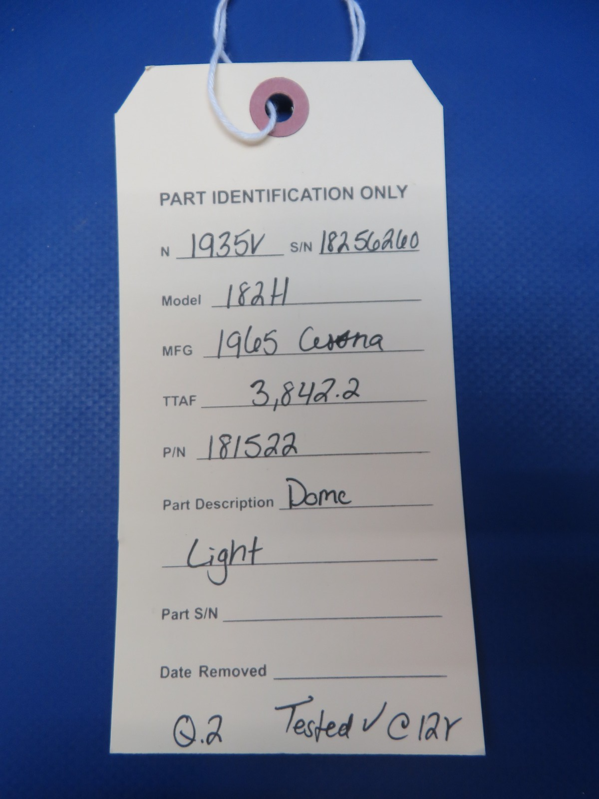 Cessna 182 / 182H Dome Light. P/N 181522. Due to multiple quantities buyer may not receive exact item pictured. This item was recently tested at 28v and found to be in working condition. Removed in good condition from a 1965 Cessna 182H N1935V, S/N 18256260. TTAF 3,842.2. Guaranteed to pass inspection or your money back.