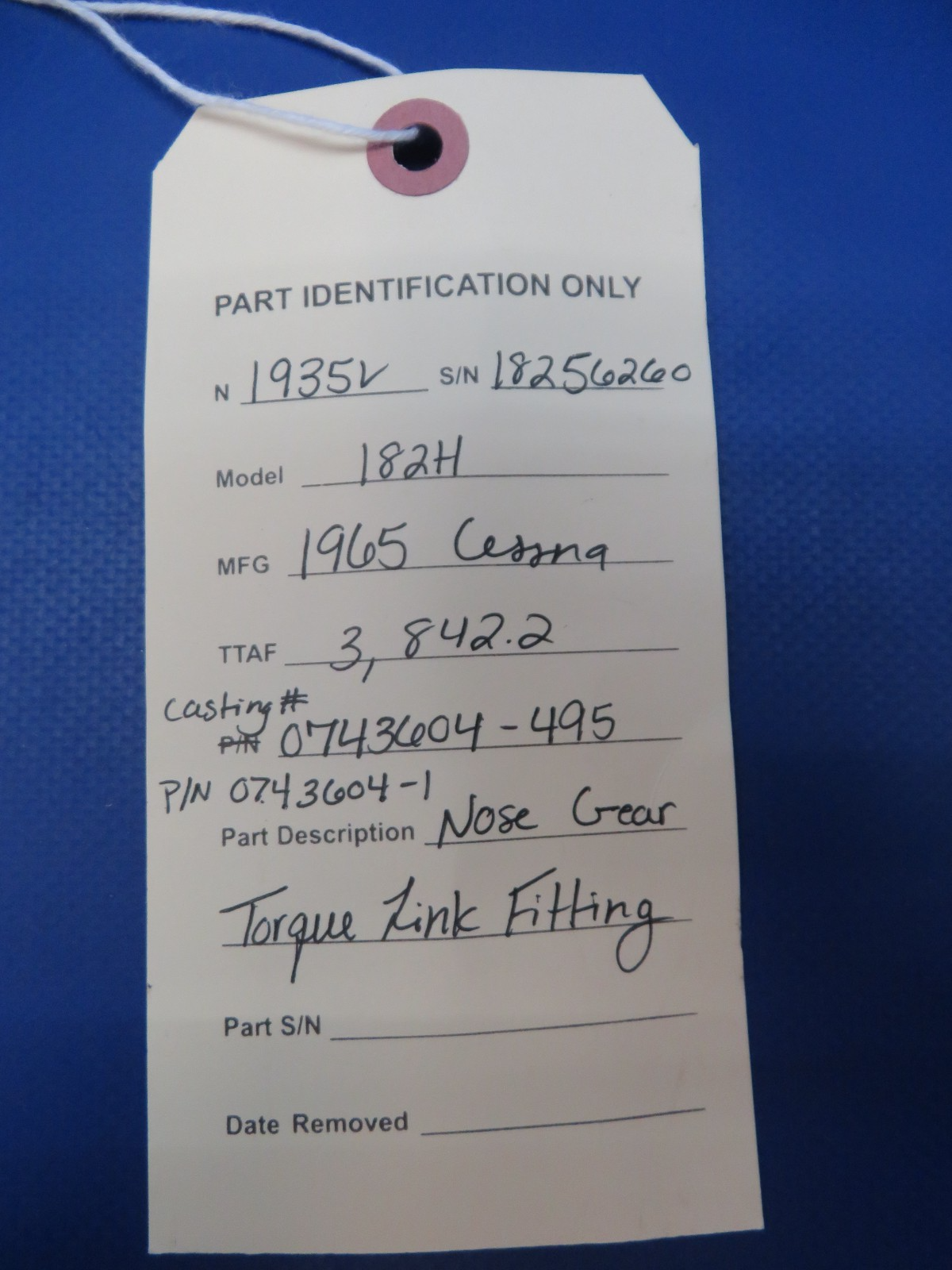 Cessna 182 / 182H Nose Gear Torque Link Fitting. P/N 0743604-1, Casting# 0743604-495. Removed in good condition from a 1965 Cessna 182H N1935V, S/N 18256260. TTAF 3,842.2. Guaranteed to pass inspection or your money back.