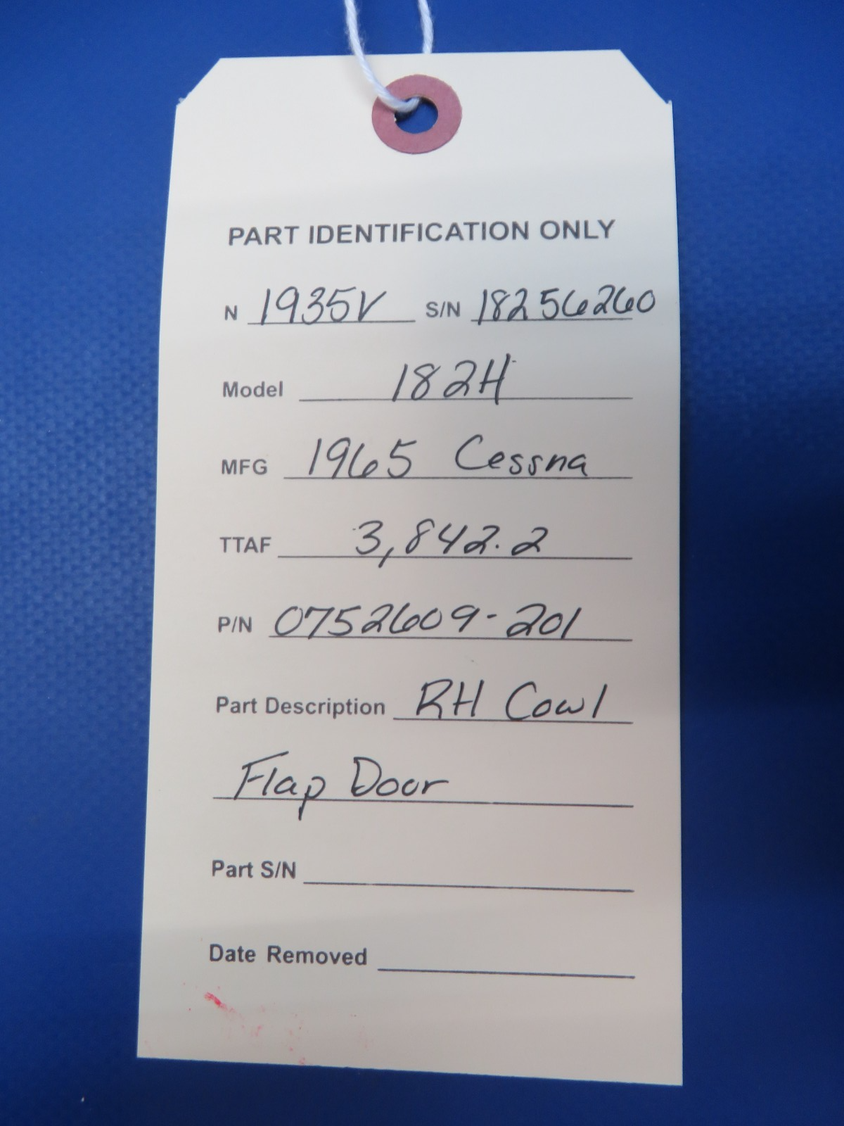 Cessna 182 / 182H Right Hand Cowl Flap Door. P/N 0752609-201. Light damage at the bottom edge. Removed in good condition from a 1965 Cessna 182H N1935V, S/N 18256260. TTAF 3,842.2. Guaranteed to pass inspection or your money back.