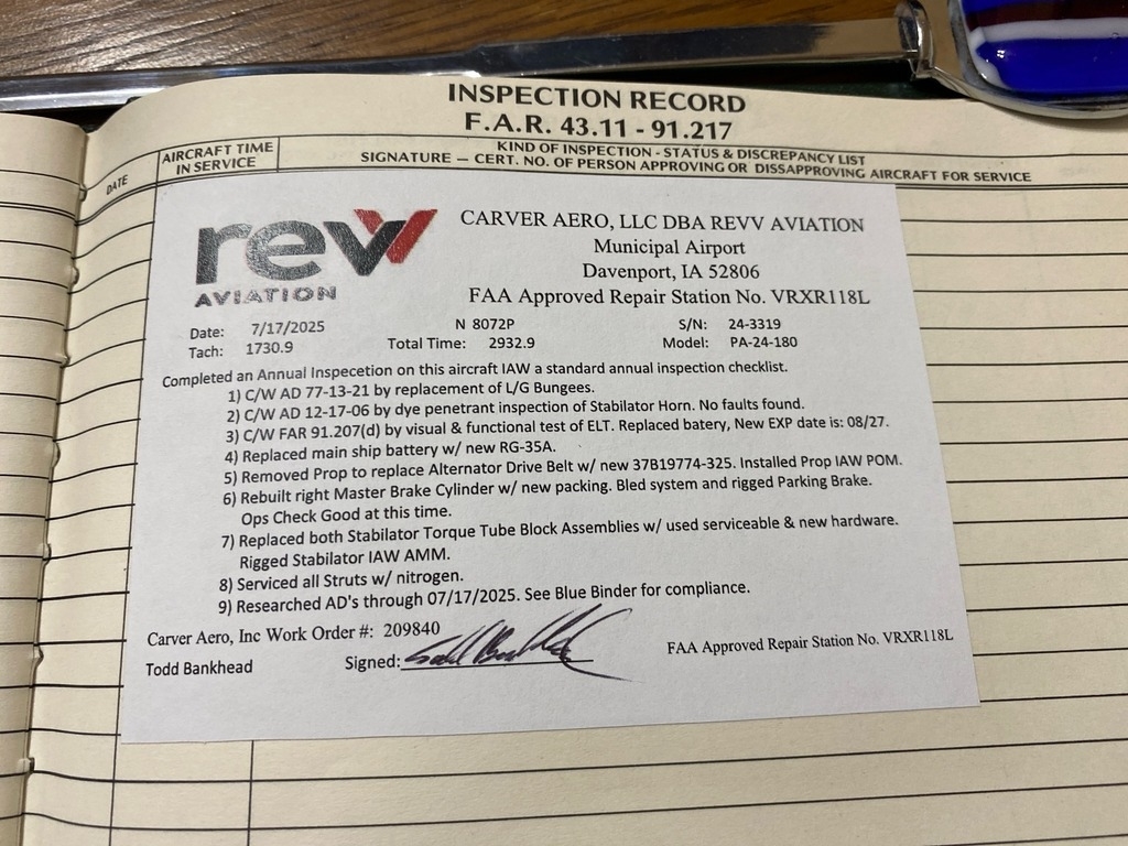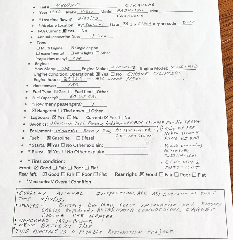 This Piper Comanche PA-24-180 is working and has been hangered from 1972-Present. The annual is current.