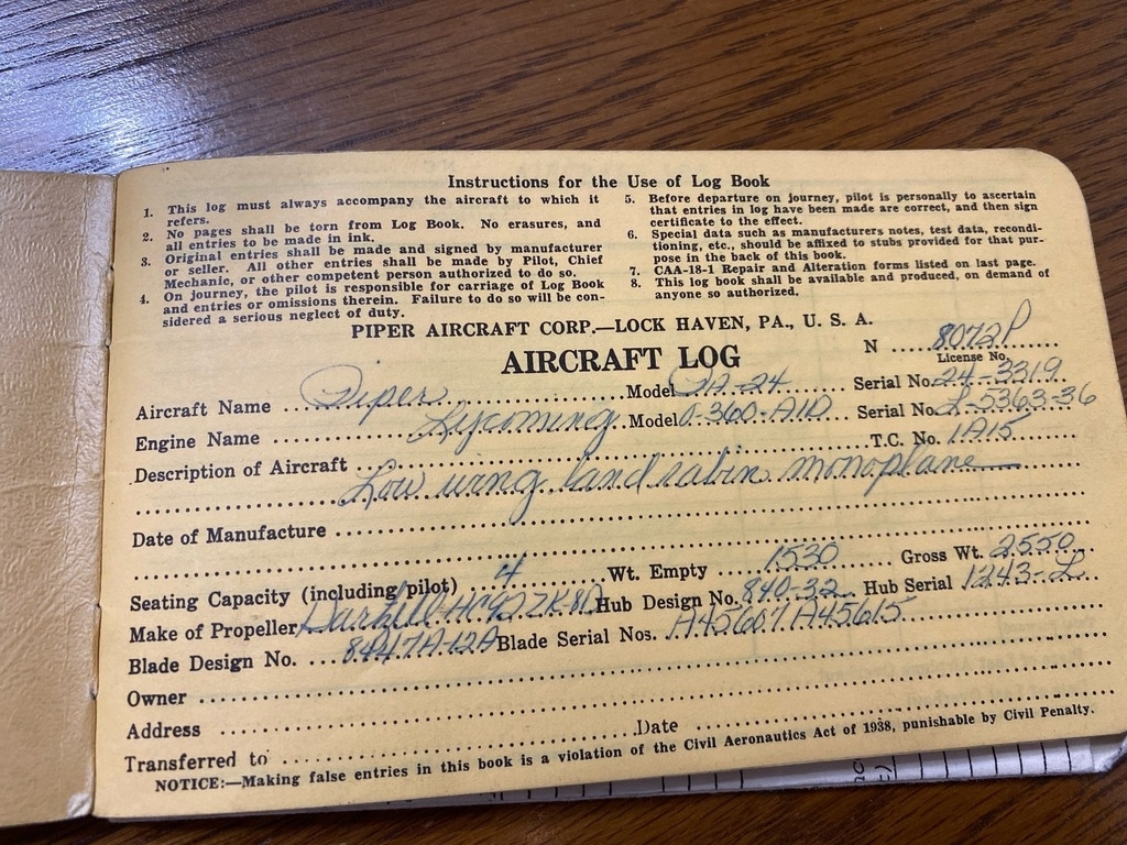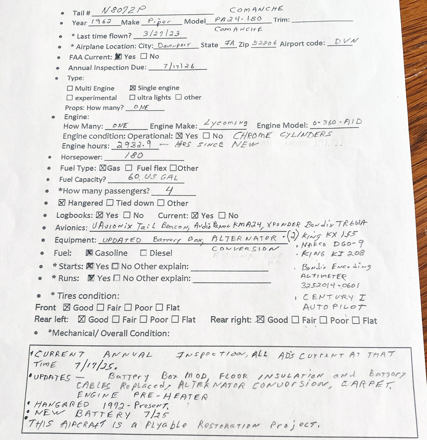 1962 Piper PA24 180 Comanche Single Propeller Airplane N8072P Annual CurrentClick here to purchase or contact the seller of this item on eBay $$ 3498838 Location Davenport IA 52807 Airport DVN |