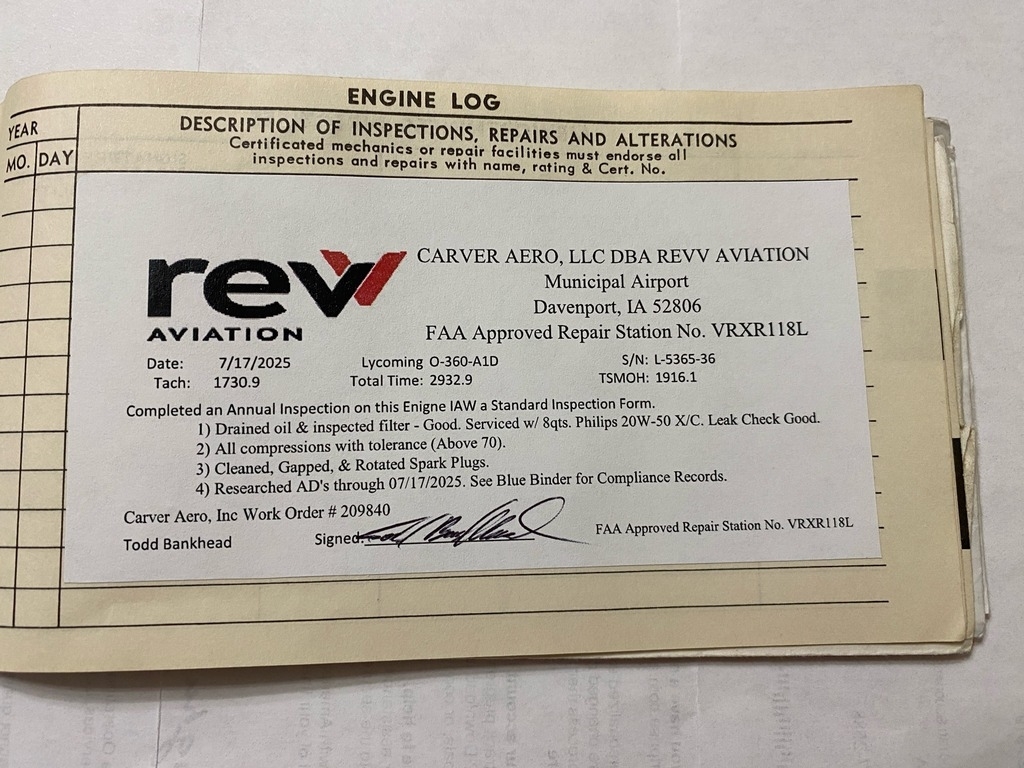 Engine 60 Gallon Gas Lycoming 0-360-A1D Engine Hours 2932.9