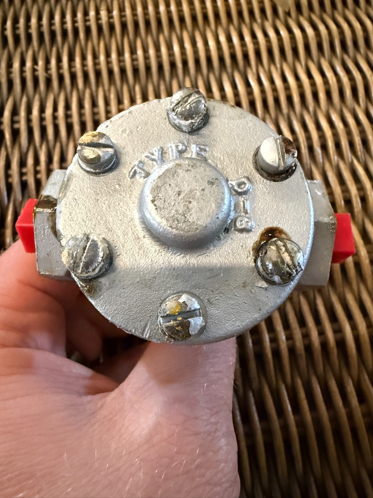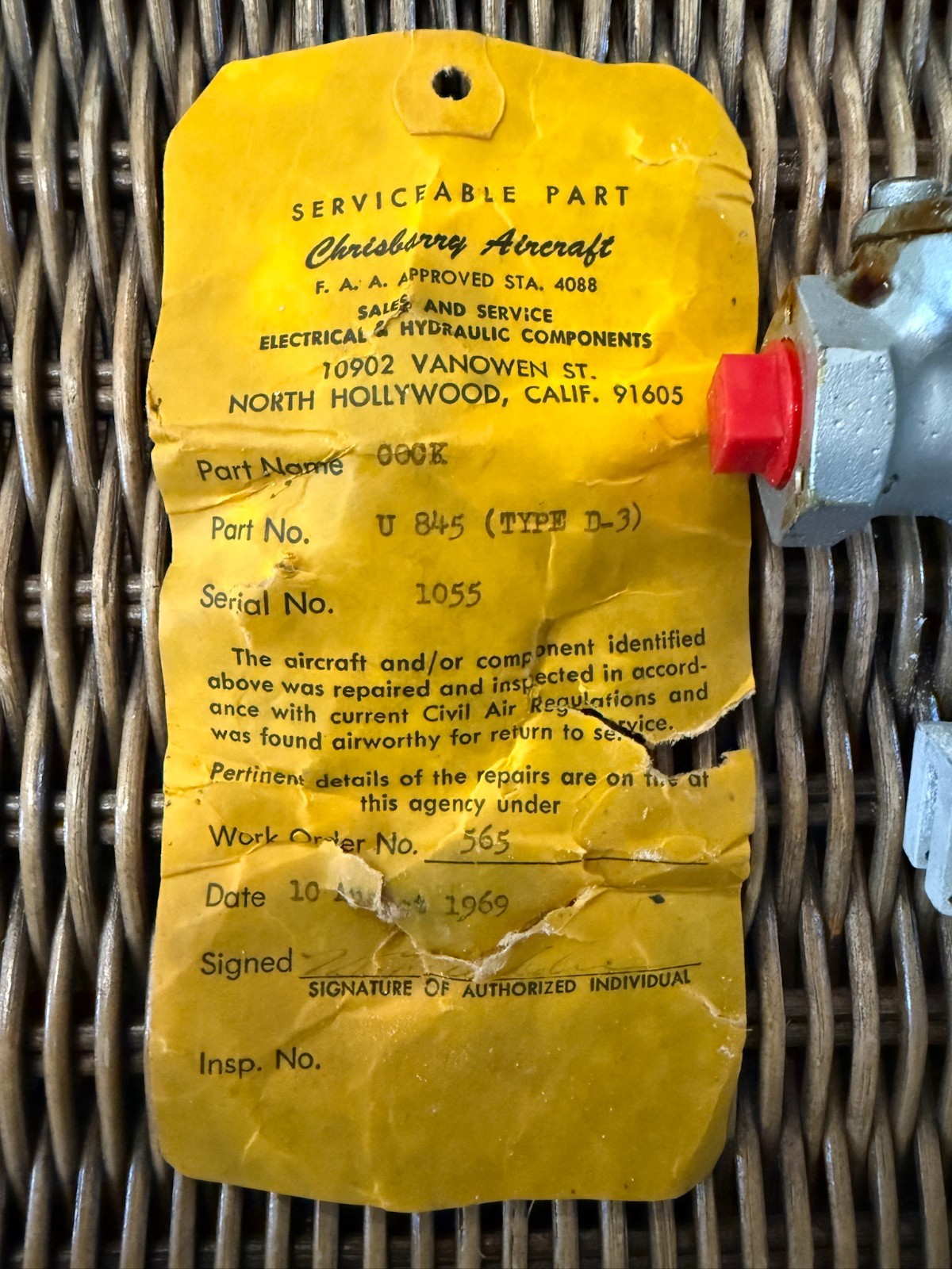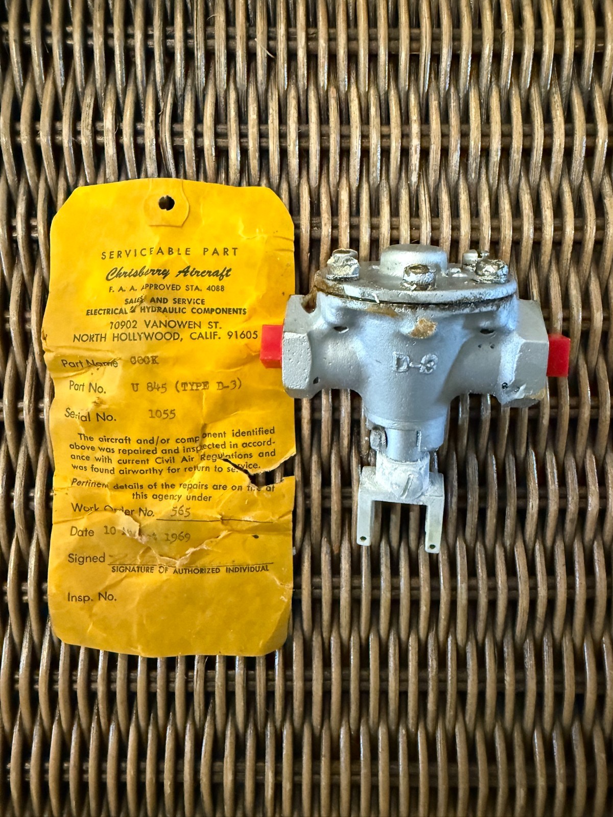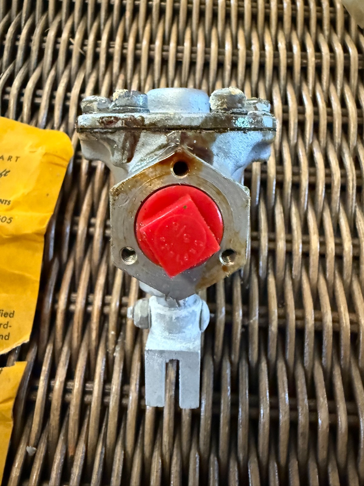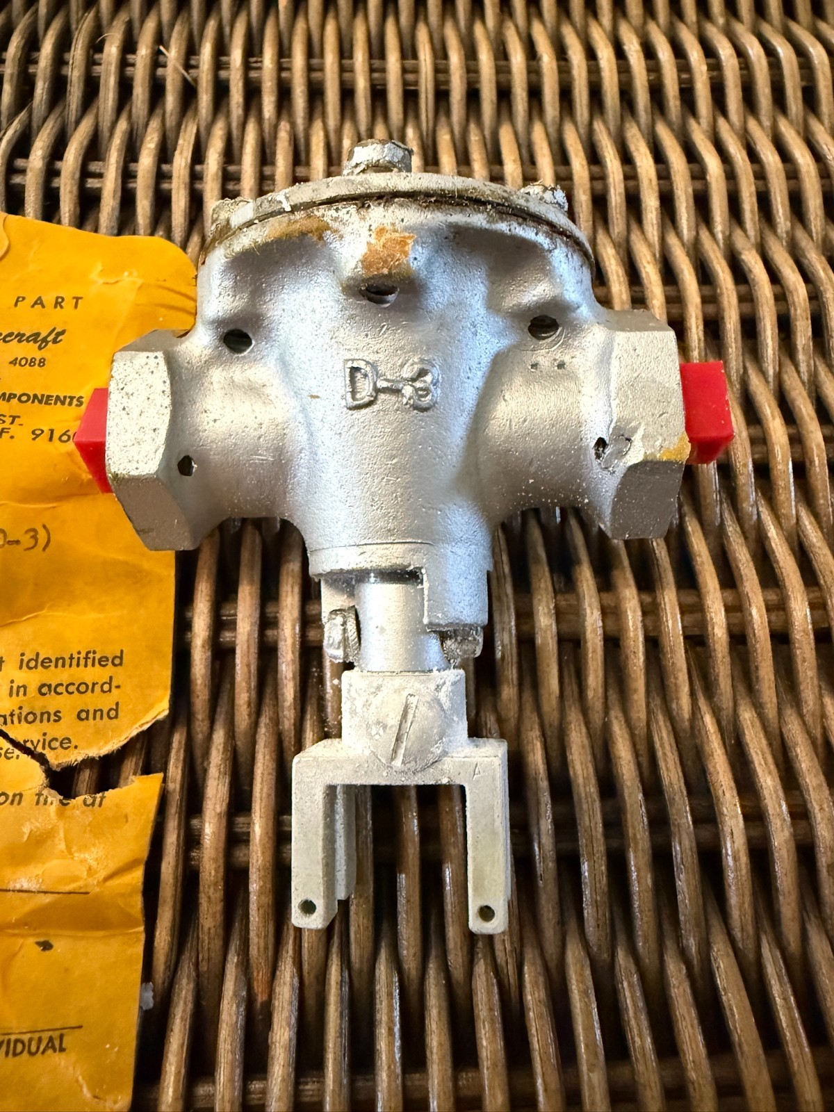 Stearman D-3 Fuel Valve. Also found on Beech 18s. Valve was overhauled by Chrisbarry Aircraft in August 1969, see yellow tag picture for reference.