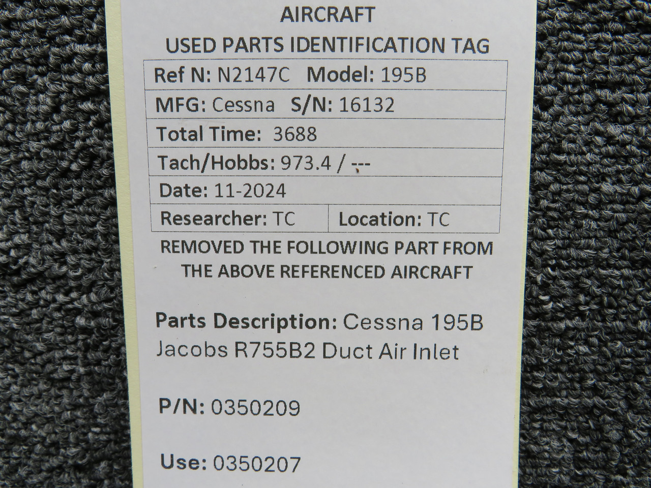 0350209 (Use: 0350207) Cessna 195B Jacobs R755B2 Duct Air InletClick here to purchase or contact the seller of this item on eBay |