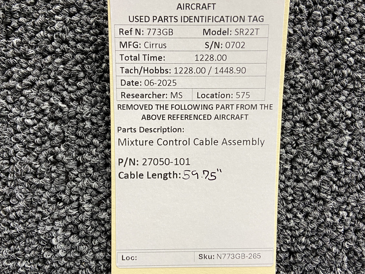 27050-101 Cirrus SR22T Mixture Control Cable Assembly (Length: 59.75”)Click here to purchase or contact the seller of this item on eBay |