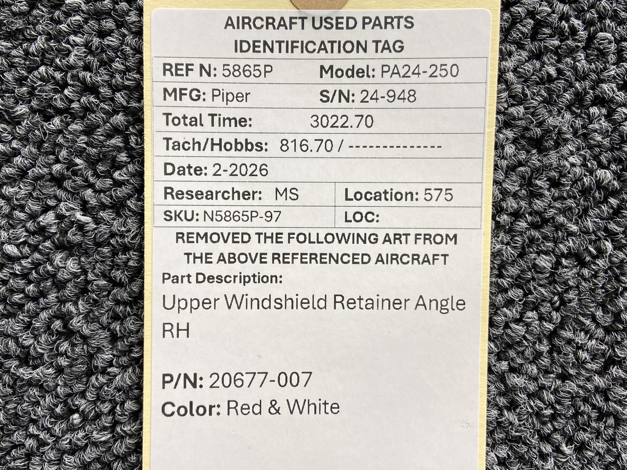 20677-007 Piper PA24-250 Upper Windshield Retainer Angle RH