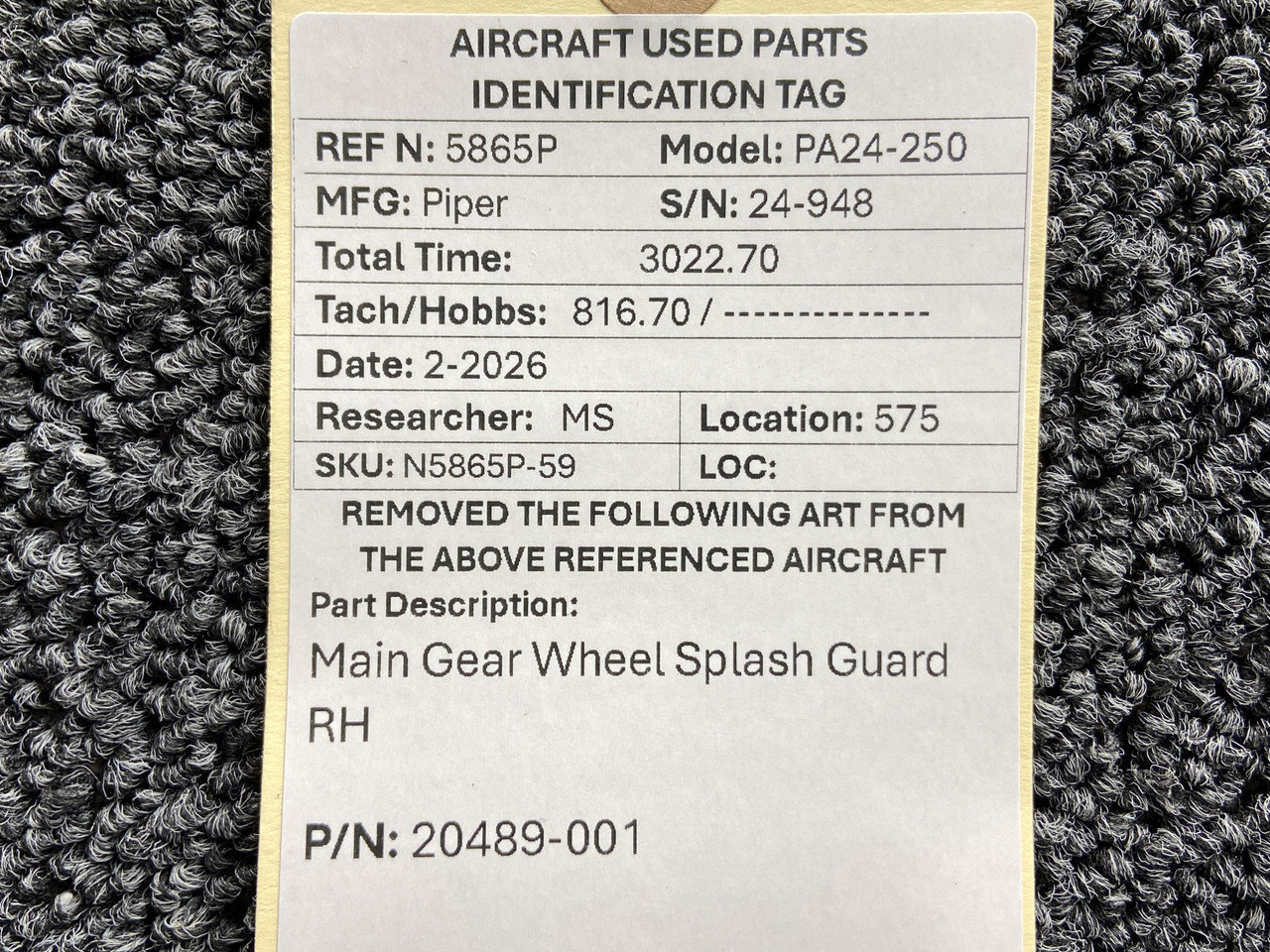 20489-001 Piper PA24-250 Main Gear Wheel Well Splash Plate Assembly RH