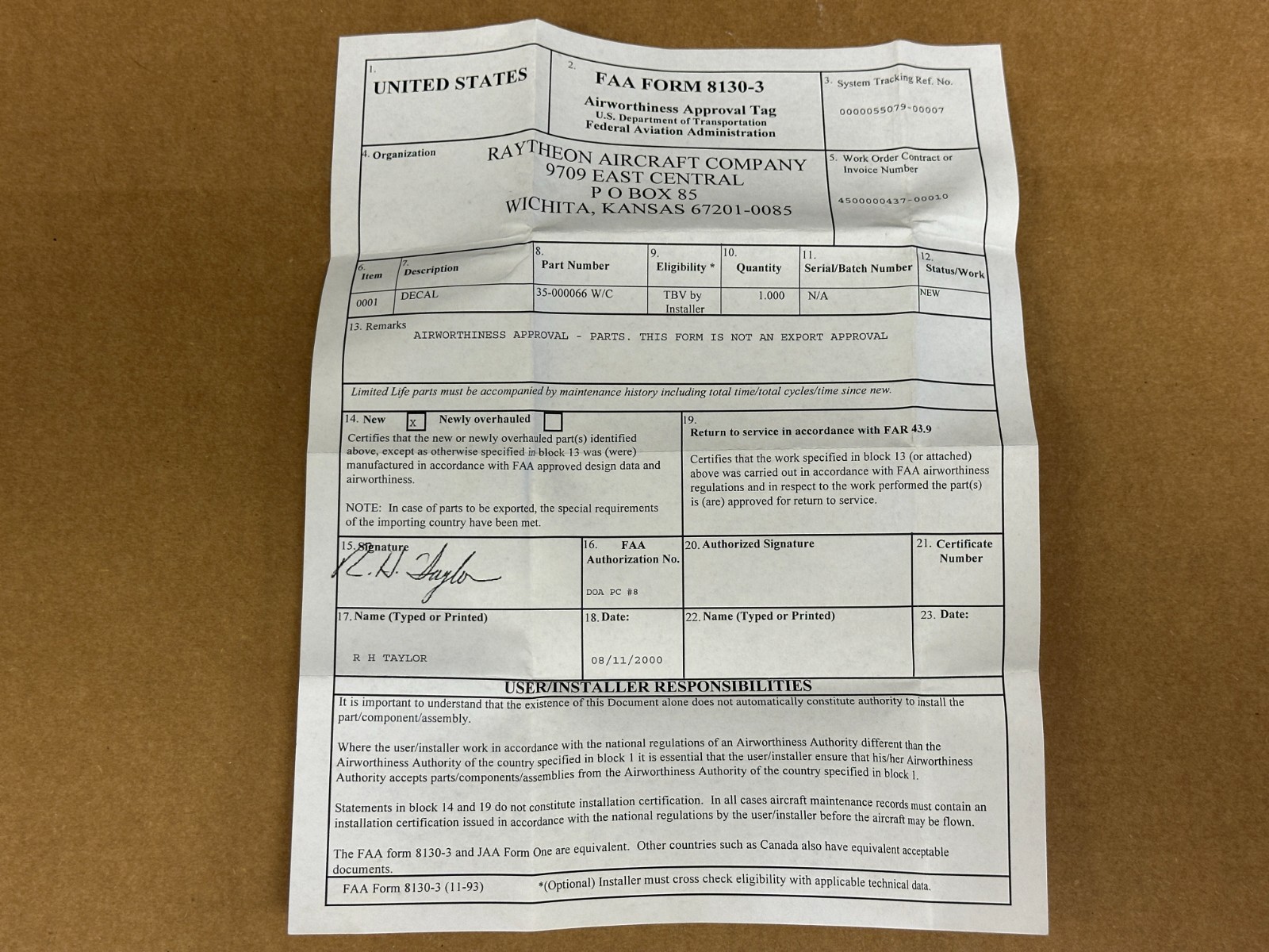 Buyer receives 1 each Beechcraft Decal Placard Ident 10 Degree 20 Degree Flap NEW 35-000066 W - C w/ Form 8130. Please contact with any questions.