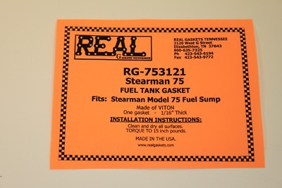 FUEL TANK GASKET for BOEING / STEARMAN - Model 75 PART #: RG-753121 FITS: Stearman Model 75 Fuel Sump ** NEW & IMPROVED ** This gasket is made of VITON which has a excellent resistance to oils, fuels, lubricants, and most mineral acids. Viton provides excellent performance in high temperature environments. Does not swell. Reusable.