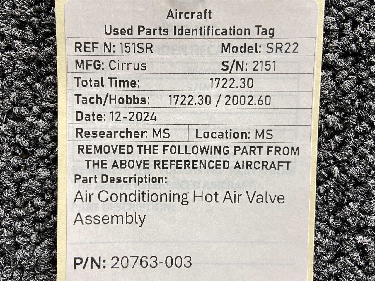 20763-003 Cirrus SR22 Air Conditioning Hot Air Valve AssemblyClick here to purchase or contact the seller of this item on eBay |