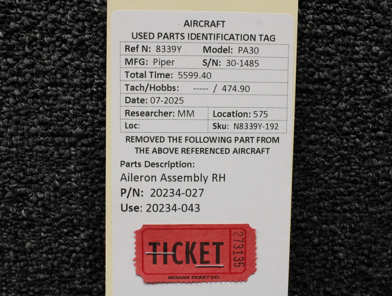 20234-027 (Use: 20234-043) Piper PA30 Aileron Assembly RH