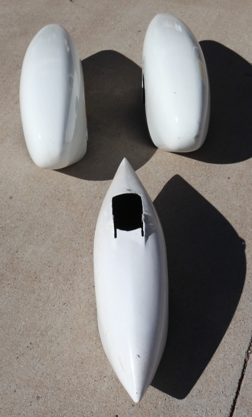Set of three white wheel fairings removed from 1957 182. They may need minor repair.