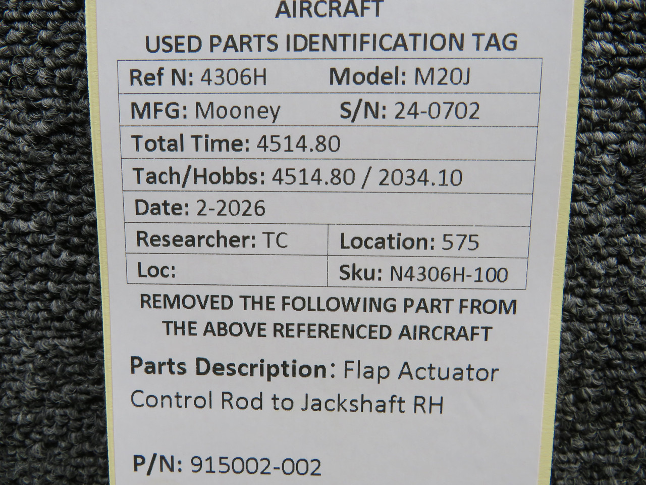 915002-002 Mooney M20J Flap Actuator Control Rod to Jackshaft RH