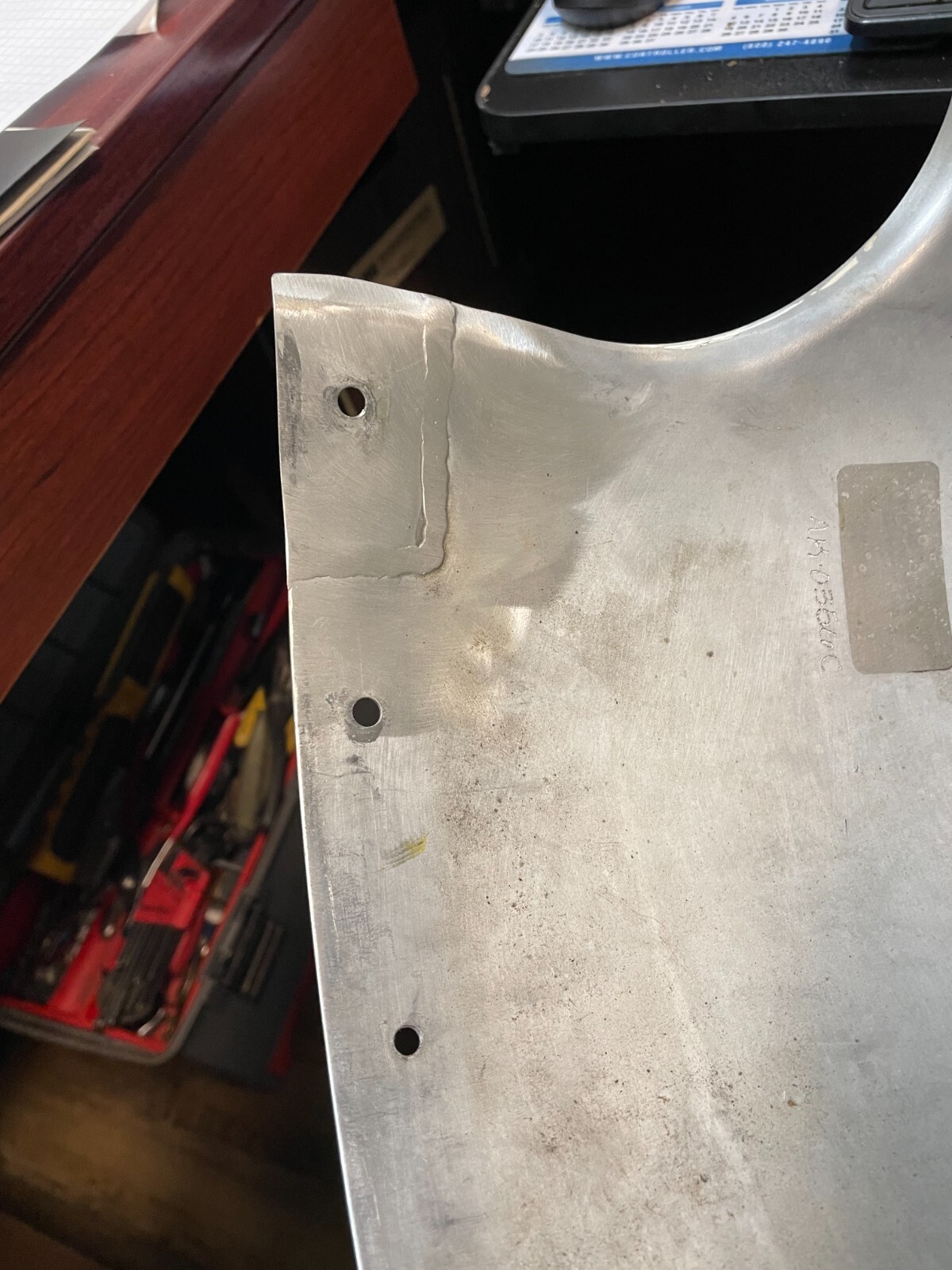 It has 2 weld-repaired screw holes. In good condition (see photos). Guaranteed or Return within 30 days for refund . Buyer pays return shipping.