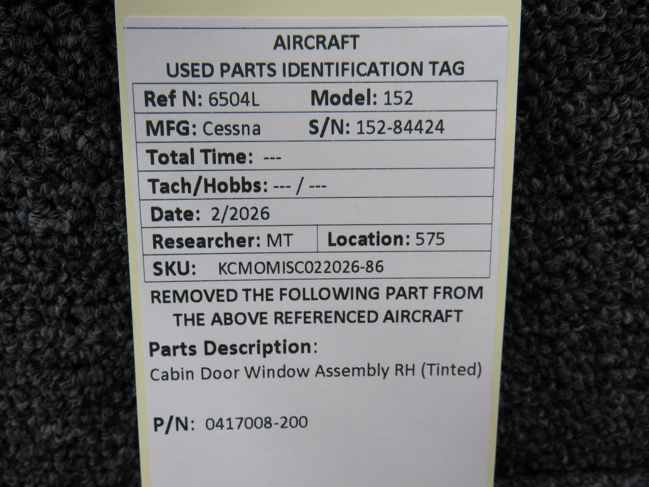 0417008-200 Cessna 152 Cabin Door Window with Latch RH (Tinted)Click here to purchase or contact the seller of this item on eBay |